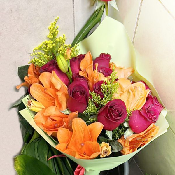 Ramo de 12 rosas y 3 tallos de Lilis con follaje